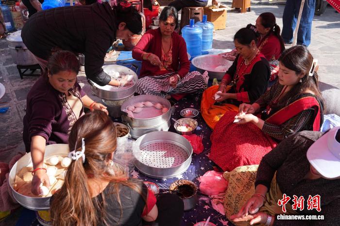 12月4日,尼泊尔加德满都,妇女在摊位后围坐,一同制作尤麻瑞。 中新社记者 崔楠 摄
