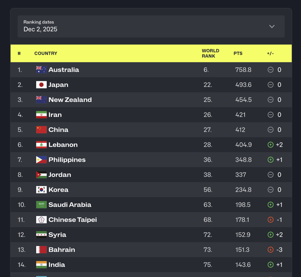亚洲球队中,排名最高的仍然是澳大利亚队(世界排名第六),其次分别为日本队、新西兰队和伊朗队,中国队位列亚洲区第五。