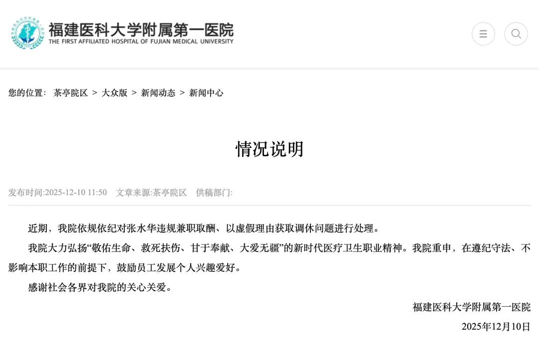 中国网12月10日讯 12月10日中午,福建医科大学附属第一医院发布情况说明:近期,该院依规依纪对张水华违规兼职取酬、以虚假理由获取调休问题进行处理。