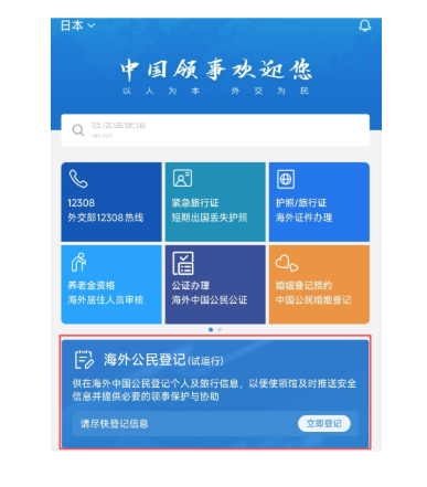 为有效保护在日中国公民人身安全,进一步帮助在日中国公民更好获得领事保护与服务,外交部“中国领事”APP推出“海外公民登记”功能模块并已全面上线。中国驻日本大使馆提醒在日中国公民: