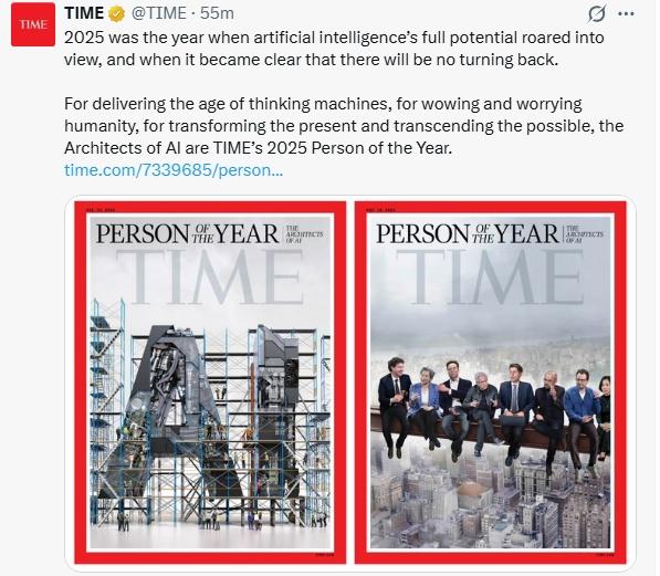 《时代》周刊在社交媒体上称,2025年是人工智能潜力全面爆发且无可回头的一年。