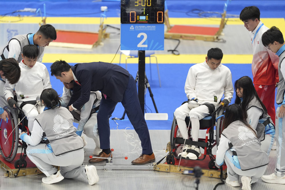 12月10日,裁判和志愿者在男子个人重剑C级金牌赛前帮助广东一团选手钟英杰(左)和罗兴东固定轮椅。新华社记者 侯俊 摄