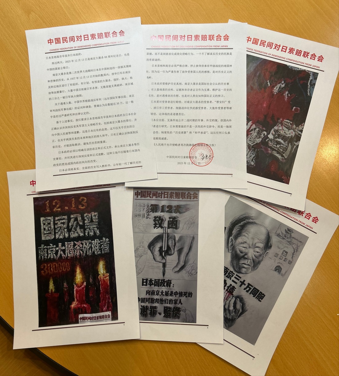 中新网12月13日电 (田野青)南京大屠杀88周年之际,中国民间对日索赔联合会通过日本驻华大使馆,致信日本政府及首相高市早苗,要求就南京大屠杀的罪行向中国人民谢罪并赔偿。