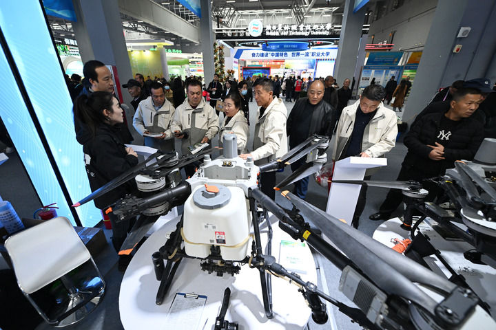 2025年10月25日,参观者在杨凌农高会上了解大疆农业无人机。新华社记者 李一博 摄