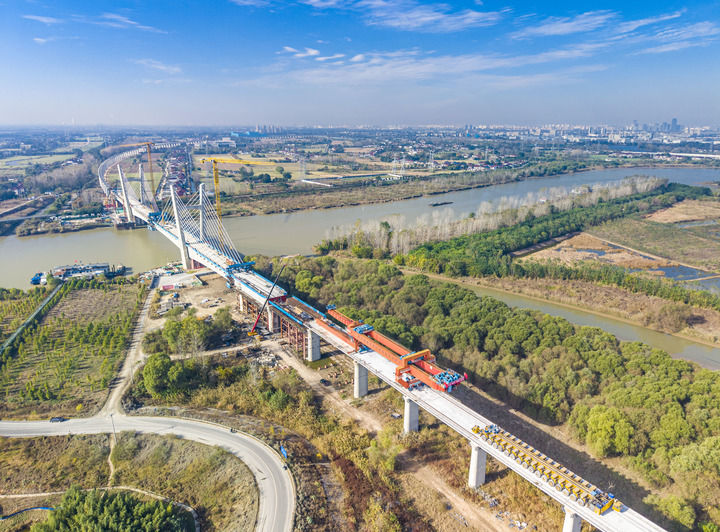 2025年11月20日,中铁建大桥局施工机械在沪渝蓉高铁江都段最后一榀箱梁架设现场作业(无人机照片)。新华社发(任飞摄)