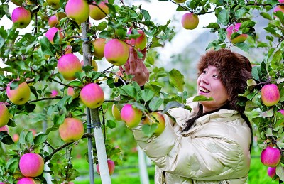 四川茂县九顶农牧苹果园里,一名来自成都的游客体验苹果采摘。新华社发