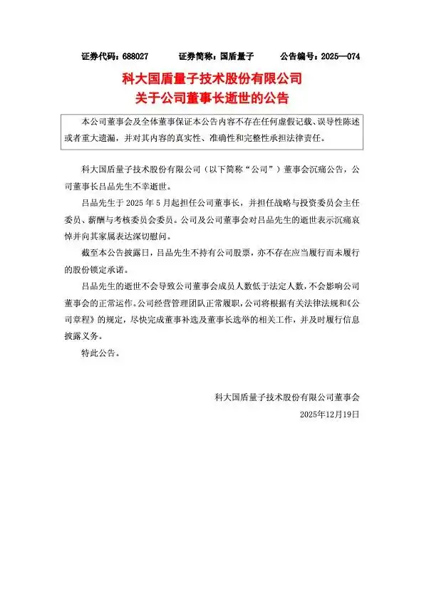 中国网12月19日讯 科大国盾量子技术股份有限公司董事会18日发布公告称,该公司董事长吕品逝世。
