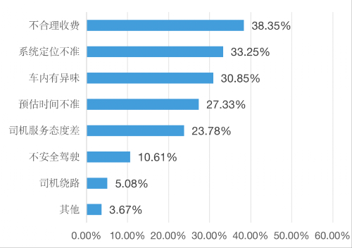 调查结果显示,消费者选择网约车时,最担心遇到“司机绕路”(46.90%)和“司机服务态度差”(43.51%)等服务提供者的道德风险。在实际消费中,消费者最常遇到的是“不合理收费”(38.35%)和“系统定位不准”(33.25%)等运营层面问题。