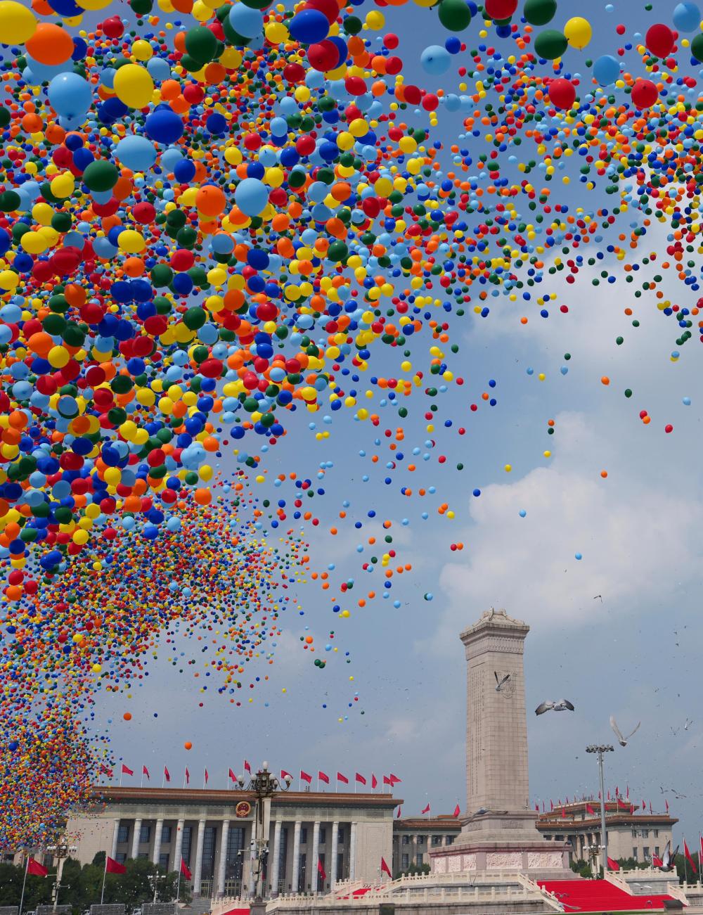 空中梯队飞过天安门广场时,王伟烈士的妻子阮国琴在观礼台上把王伟的照片举向蓝天。
