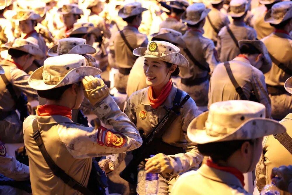 7月3日,在贵州省榕江县,完成任务的抗洪抢险救援队伍撤离时,救援队员、退伍军人陈通刚与路边送行的少先队员相互行礼。