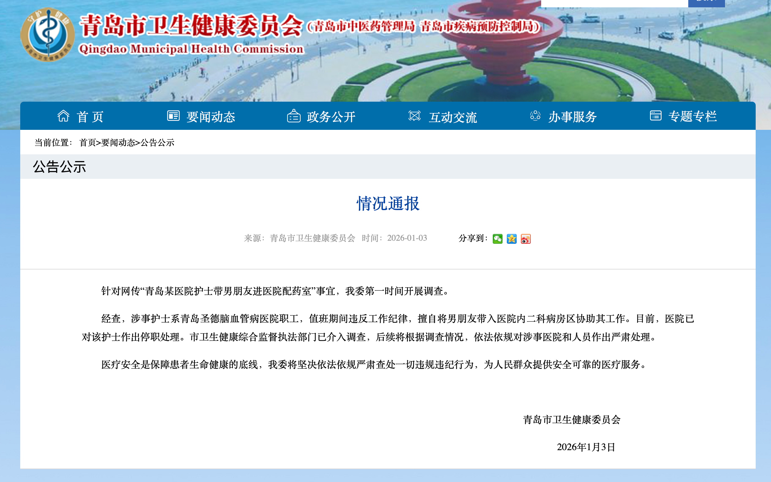 青岛通报“某医院护士带男朋友进配药室”:涉事人员已被停职