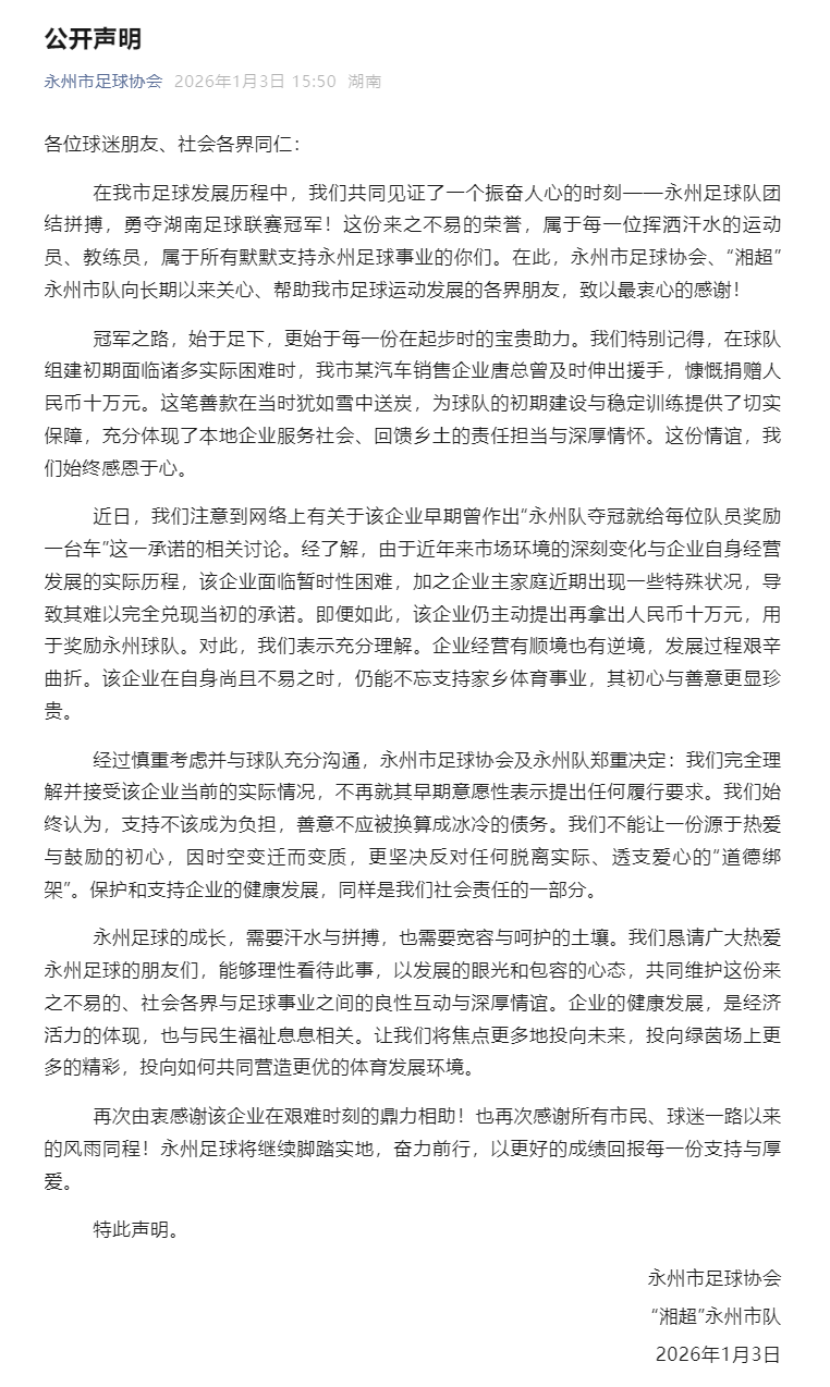 中国网1月3日讯 1月3日,永州市足球协会、“湘超”永州市队发布公开声明:近日,我们注意到网络上有关于该企业早期曾作出“永州队夺冠就给每位队员奖励一台车”这一承诺的相关讨论。经了解,由于近年来市场环境的深刻变化与企业自身经营发展的实际历程,该企业面临暂时性困难,加之企业主家庭近期出现一些特殊状况,导致其难以完全兑现当初的承诺。即便如此,该企业仍主动提出再拿出人民币十万元,用于奖励永州球队。对此,我们表示充分理解。企业经营有顺境也有逆境,发展过程艰辛曲折。该企业在自身尚且不易之时,仍能不忘支持家乡体育事业,其初心与善意更显珍贵。