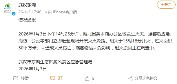 中国网1月3日讯 据武汉市东湖生态旅游风景区管理委员会官方微博1月3日消息,2026年1月3日下午14时25分许,湖北省美术馆办公区域发生火灾。接警后应急、消防、公安等部门立即赶赴现场开展灭火救援。明火于15时18分扑灭,过火面积50平方米。未造成人员伤亡,馆藏物品未受影响,起火原因正在调查中。