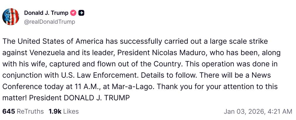 美国东部时间3日凌晨4:21左右:特朗普在社交媒体发文称,美方已成功对委内瑞拉实施打击,抓获马杜罗及其夫人,并带离委内瑞拉。