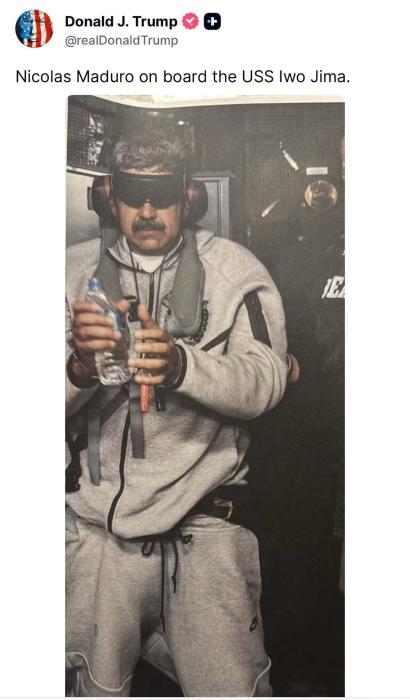 中新网1月4日电 美国总统特朗普3日在社交媒体平台上发布委内瑞拉总统马杜罗在美国军舰上戴手铐、双眼被黑布蒙住的照片,并配文“马杜罗在美国军舰上”。