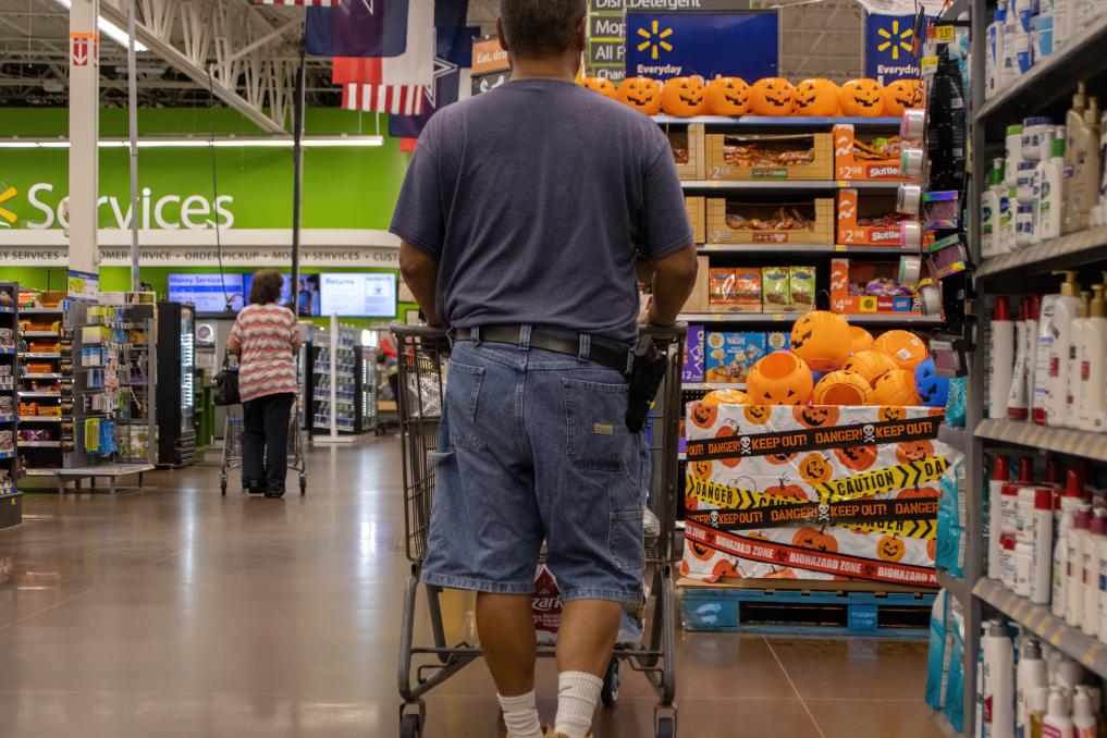 2022年8月31日,在美国得克萨斯州普莱诺市,一名男子随身携带枪支逛超市。新华社发(金新摄)