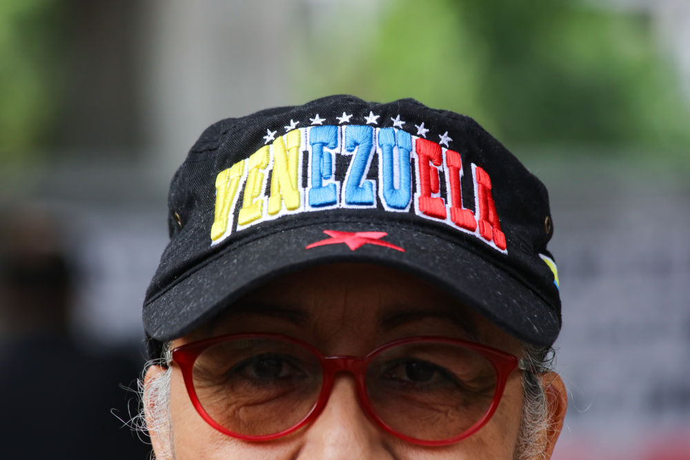 1月3日,在哥伦比亚首都波哥大的美国驻哥伦比亚大使馆外,一名妇女打出“特朗普别染指拉丁美洲”的抗议标语。