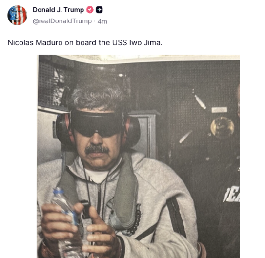 特朗普在其社交平台“真实社交”上发布了一张马杜罗在“硫磺岛”号军舰上的照片。照片中的马杜罗戴着手铐,双眼被黑布蒙住。