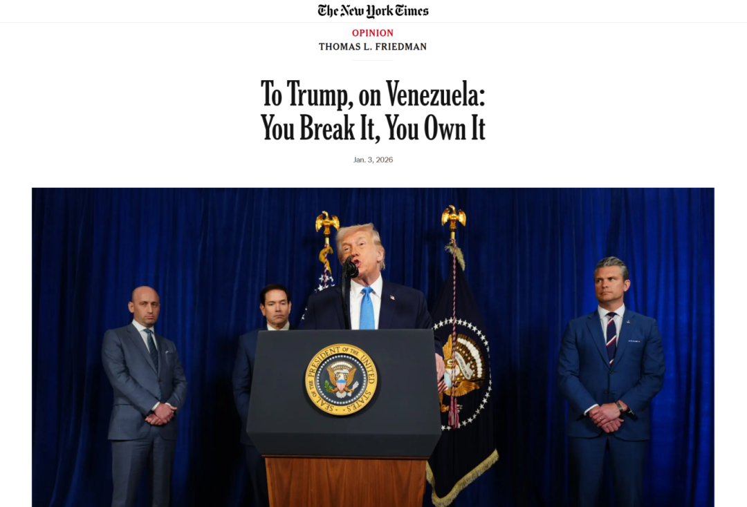 “介入”Or“不顾”,美国将面临两难。特朗普大肆宣扬“胜利”之外,不少评论对此事件的后续发展并不乐观。《纽约时报》专栏作家弗里德曼认为,基于美国过去在其他地区的类似干预,马杜罗在美国“受审”后委内瑞拉将走向何方“充满疑问”。他列举了利比亚、伊拉克等案例,认为美国“接管”委内瑞拉将是“巨大工程”;而“MAGA”群体恐怕也不会接受美国的对外过度干预。接下来委内瑞拉将成为特朗普怎样的“政治遗产”?美国恐将面临两难的局面。