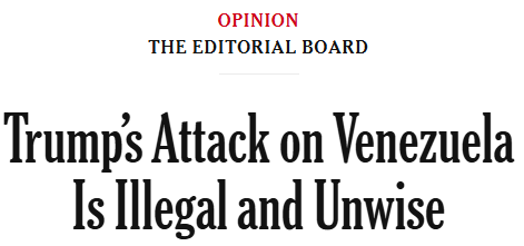 1月3日,《纽约时报》刊发社论《特朗普对委内瑞拉的攻击非法且不明智》。