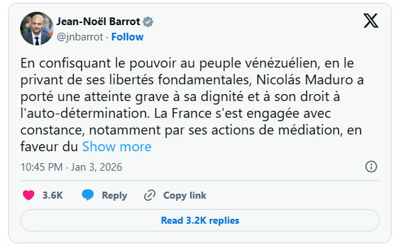 法国:法国外交部长巴罗在社交媒体发文,批评美国军事行动违背国际法赖以建立的不使用武力原则。他强调,持久的政治解决方案不能由外部强加,只有主权人民有权决定自己的未来,法国将始终遵循《联合国宪章》,以该宪章指导国际行动。