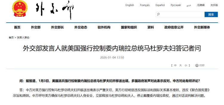 中国外交部发言人表示,中方对美方强行控制马杜罗总统夫妇并移送出境表示严重关切,美方行径明显违反国际法和国际关系基本准则,违反《联合国宪章》宗旨和原则。中方呼吁美方确保马杜罗总统夫妇人身安全,立即释放马杜罗总统和夫人,停止颠覆委内瑞拉政权,通过对话谈判解决问题。