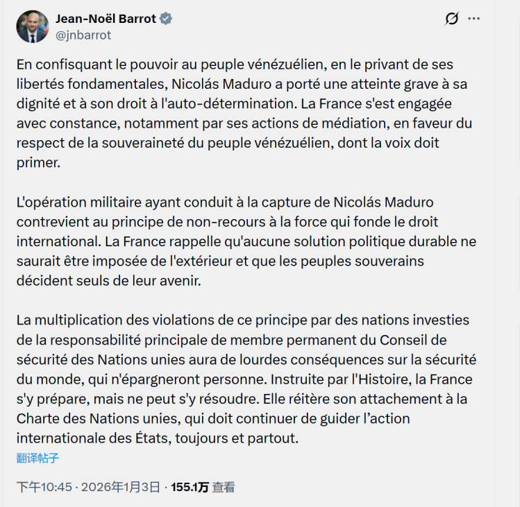 法国外交部长让-诺埃尔·巴罗表示,美国在委内瑞拉的行动破坏了国际法。“导致尼古拉斯·马杜罗被俘的军事行动违反了禁止使用武力的国际法原则。法国重申,任何持久的政治解决方案都不能由外部强加,只有主权国家人民才能决定自己的未来。”