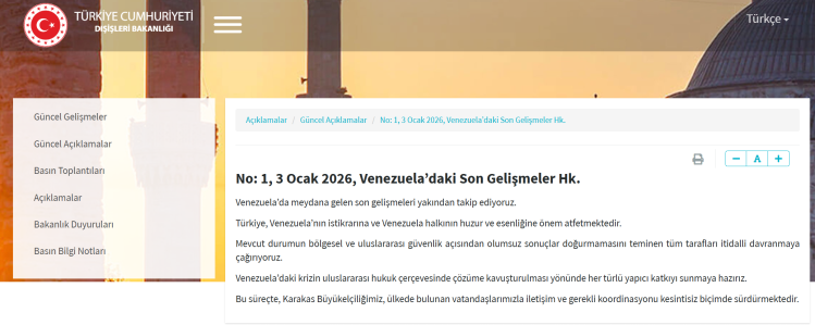 土耳其外交部同日发表声明称,土方正密切关注委内瑞拉局势发展,呼吁有关各方保持克制,避免当前局势对地区及国际安全造成不利影响。土耳其总统顾问杰米尔·埃特姆在社交媒体上表示:“我们站在委内瑞拉人民和马杜罗总统一边!这种强盗行径绝不能逃脱惩罚。”