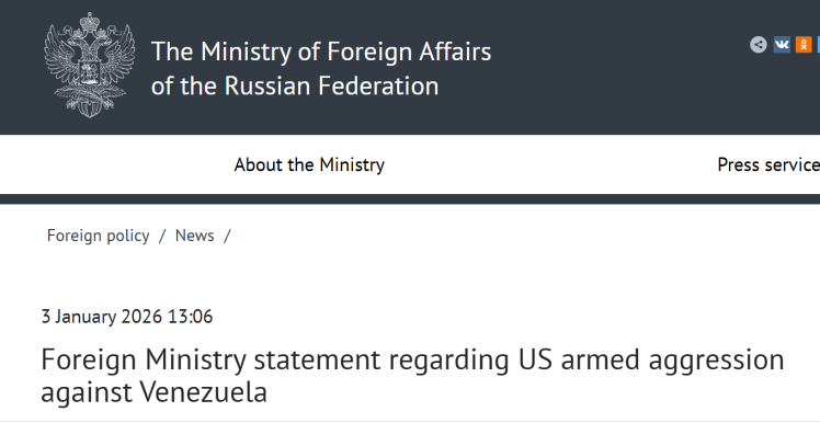 俄罗斯外交部发表声明称,莫斯科对美国对委内瑞拉实施的“武装侵略行为”深感关切并予以谴责。俄方认为,在当前形势下,防止事态进一步升级并通过对话寻找解决途径十分重要,必须保证委内瑞拉有权决定自己的命运,不受任何破坏性军事干预。俄罗斯外交部还表示,对马杜罗及其妻子被俘“极为关切”,称美军此类行为“构成对独立国家主权的不可接受的侵犯”。