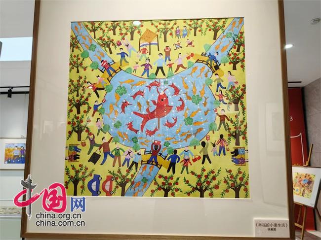 2025年12月2日,在位于浙江嘉兴的中国现代民间绘画秀洲创作基地,2025“我们生活在这里”农民画展暨文化特派员成果展中展出秀洲农民画《幸福的小康生活》(徐美英作品)。中国网记者 彭瑶 摄