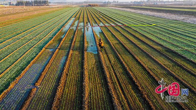 2025年11月3日,河北省遵化市东新庄镇农民在麦田浇水(无人机照片)。刘满仓 摄 新华社图片库