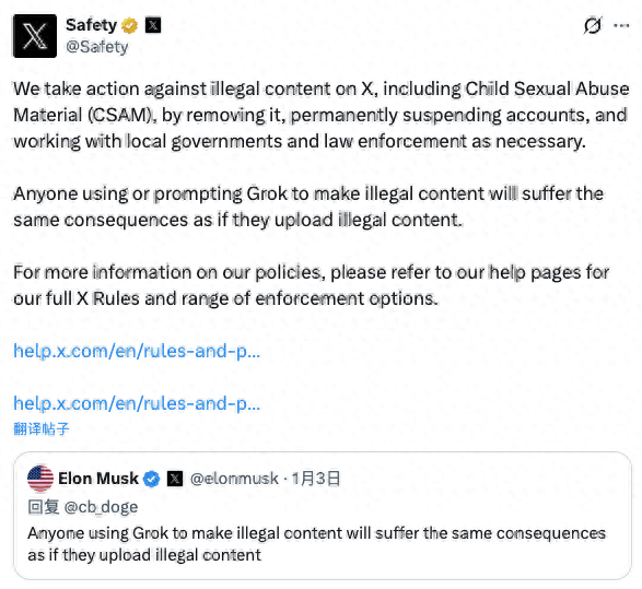 X表示,平台会对非法内容采取行动,包括删除资料、封号,并在必要时与执法机构展开合作。马斯克也在周末的一条帖子中强调,任何使用“格罗克”制作非法内容的人,将面临与上传非法内容同样的法律后果。