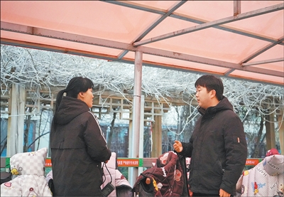 1月5日,河北省曲阳县永宁社区永宁花园小区内,社区干部(右)向居民了解车棚使用情况。受访者供图