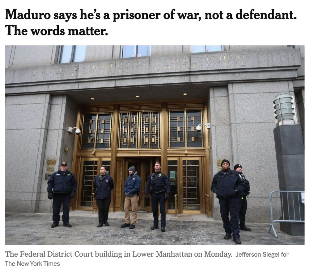 △《纽约时报》报道,马杜罗在庭审中坚称自己是军事行动中的“战犯”,而不是普通的刑事“被告”。