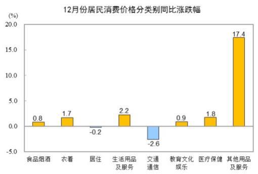 12月份,食品烟酒类价格同比上涨0.8%,影响CPI(居民消费价格指数)上涨约0.24个百分点。食品中,鲜菜价格上涨18.2%,影响CPI上涨约0.39个百分点;鲜果价格上涨4.4%,影响CPI上涨约0.09个百分点;水产品价格上涨1.6%,影响CPI上涨约0.03个百分点;蛋类价格下降12.7%,影响CPI下降约0.09个百分点;畜肉类价格下降6.1%,影响CPI下降约0.19个百分点,其中猪肉价格下降14.6%,影响CPI下降约0.20个百分点;粮食价格下降0.3%,影响CPI下降约0.01个百分点。
