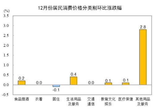 12月份,全国居民消费价格环比上涨0.2%。其中,城市上涨0.2%,农村上涨0.2%;食品价格上涨0.3%,非食品价格上涨0.1%;消费品价格上涨0.3%,服务价格持平。