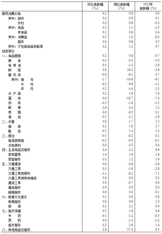 国家统计局:2025年12月份居民消费价格同比上涨0.8%