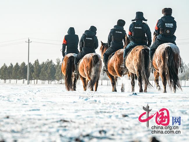 2025年12月2日,内蒙古“海东青”骑警队骑警在内蒙古呼伦贝尔市陈巴尔虎旗的雪原上巡逻。新华社记者 达日罕 摄 新华社图片库