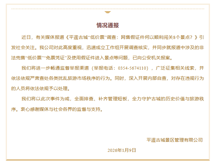 近日,有关媒体报道《平遥古城“低价票”调查:网售假证件何以顺利闯关8个景点?》引发社会关注。我公司对此高度重视,迅速成立工作组开展调查核实,并同步就报道中涉及的非法兜售“低价票”“免票凭证”及使用假证件进入景点等问题,已向公安机关报案。