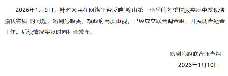 中国网1月10日讯 据“喀喇沁融媒体”微信公众号消息,内蒙古赤峰市喀喇沁旗联合调查组1月10日上午发布情况通报:2026年1月9日,针对网民在网络平台反映“锦山第三小学的冬季校服夹层中发现薄膜状物质”的问题,喀喇沁旗委、旗政府高度重视,已经成立联合调查组,开展调查处置工作。后续情况将及时向社会发布。
