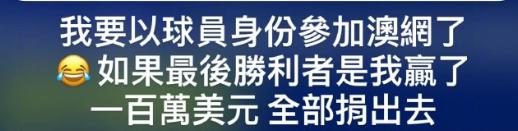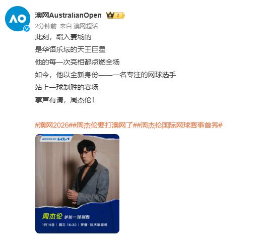 周杰伦在个人社媒写道:“我要以球员身份参加澳网了,如果最后胜利者是我赢了一百万美元,全部捐出去。”