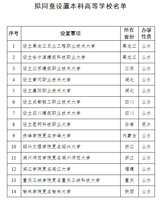 中国网1月12日讯 据教育部网站消息,1月12日,教育部发展规划司发布《关于拟同意设置本科高等学校的公示》。