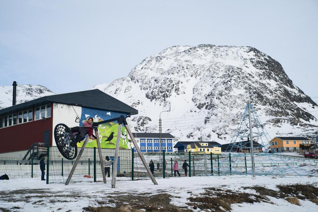 2025年3月21日,在丹麦自治领地格陵兰岛纳尔萨克,孩子们在路边玩耍。新华社记者彭子洋摄