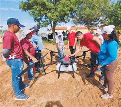 在巴西北里奥格兰德州联邦教育科技学院阿波迪校区农场,巴西师生和农户学习操作中国生产的无人机。