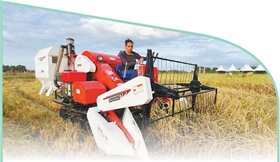在巴西阿波迪的一处稻田里,一名巴西妇女在家庭农场操作中国生产的水稻联合收割机。