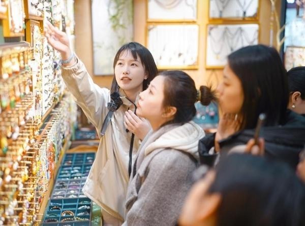 随着选品经验日渐丰富、对义乌国际商贸城越来越熟悉,如今,林女士不光直播,还做自媒体、带队游学考察、为客户寻品找货、当中高端饰品买手,事业版图逐渐拓展。图为林女士在义乌国际商贸城带游学团的场景。受访者供图