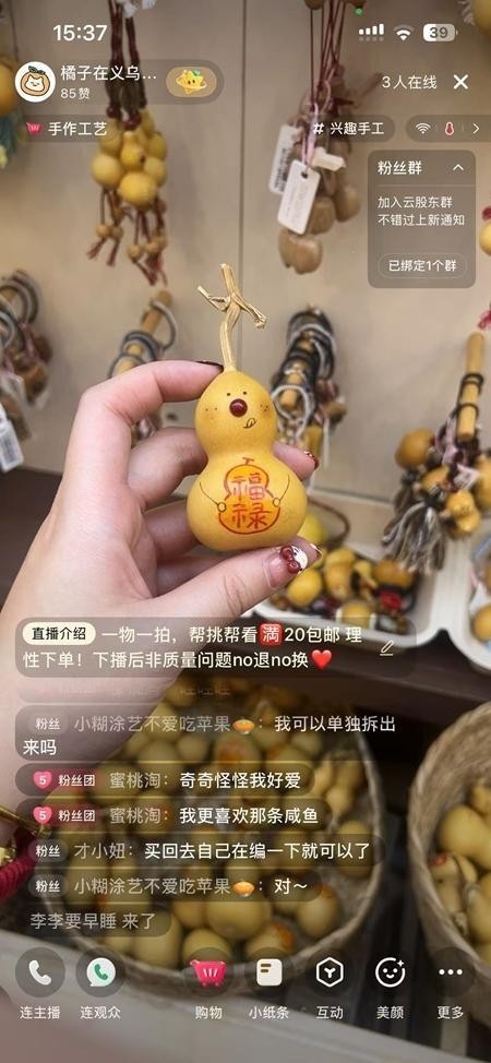 2026年1月11日,马女士在义乌国际商贸城一家文玩店铺内直播小葫芦,图为她直播间的截图。受访者供图