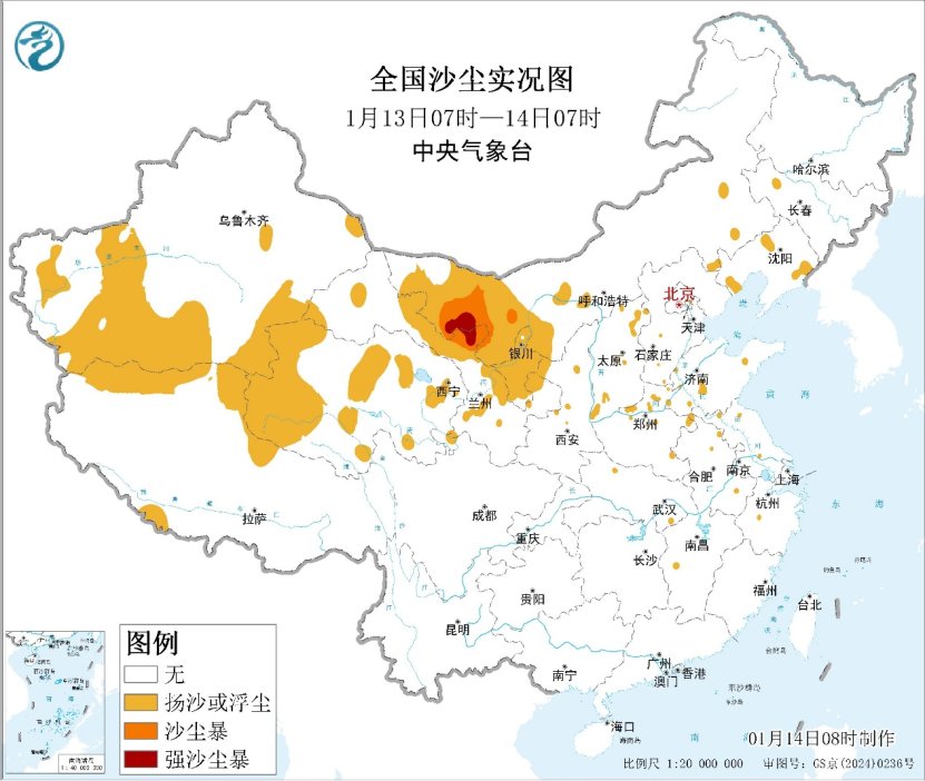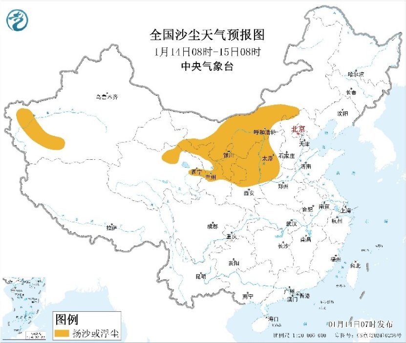 中国网1月14日讯 据中央气象台网站消息,昨日,受冷空气影响,新疆北部、西藏、青海西部和南部、甘肃、宁夏、内蒙古中西部等地最大阵风有8~10级、局地11~12级;新疆南疆盆地、青海西部、甘肃中部、宁夏、内蒙古西部等地出现扬沙或浮尘,局地出现沙尘暴。