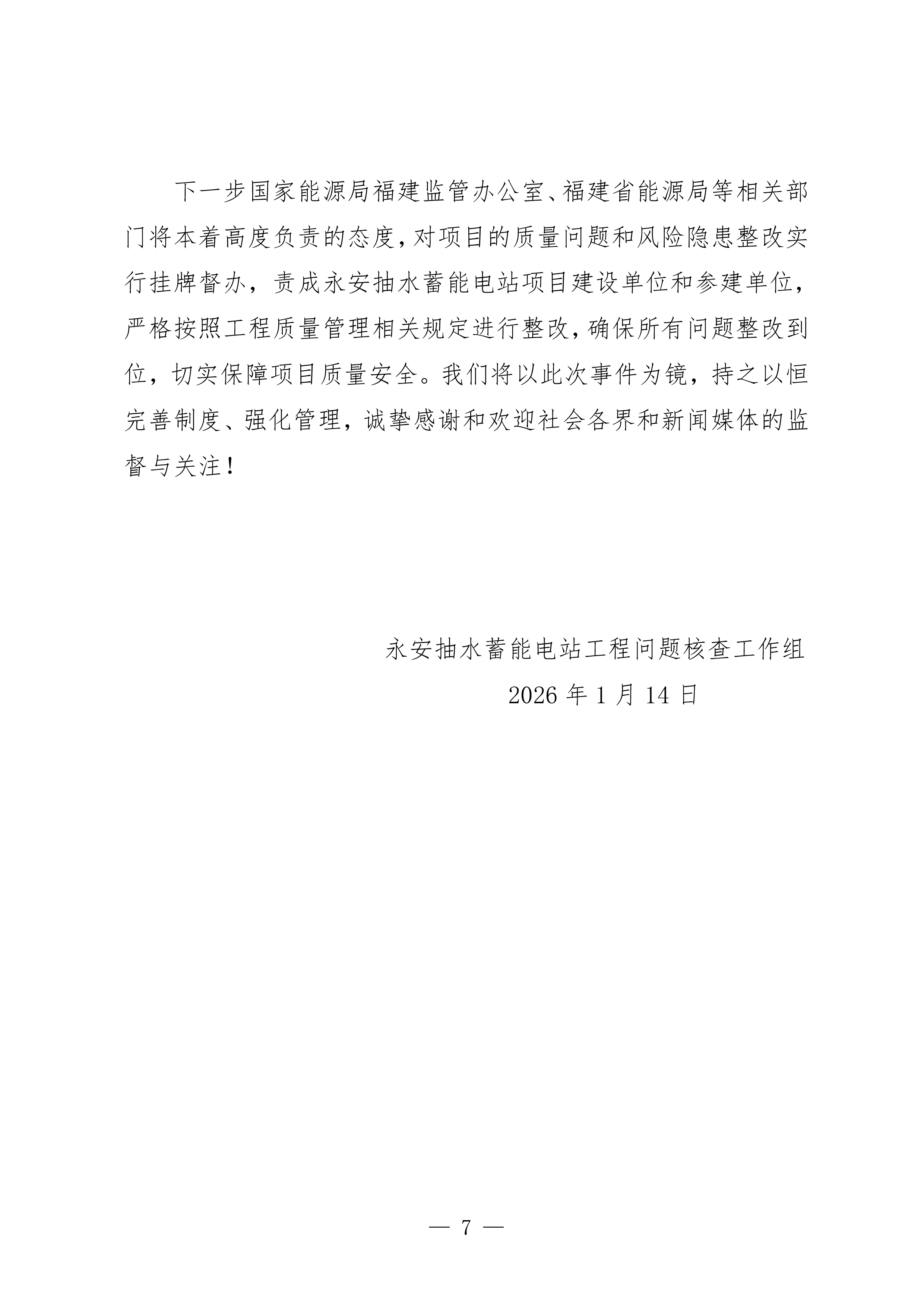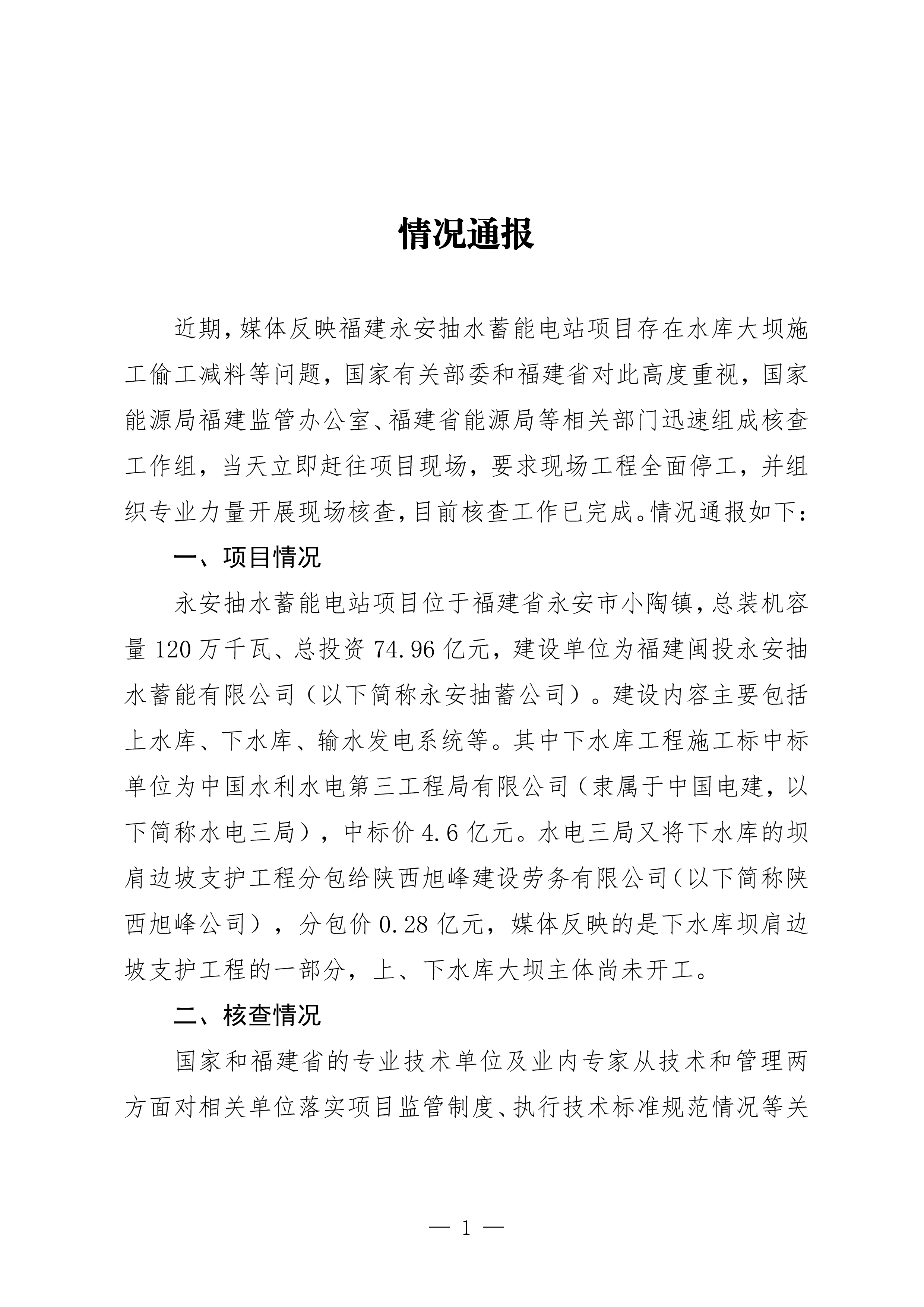 中国网1月14日讯 针对此前媒体反映福建永安抽水蓄能电站项目存在水库大坝施工偷工减料等问题,1月14日,国家能源局福建监管办公室网站发布情况通报。通报称,相关问题基本属实。国家相关部委和福建省已依法依规对71名涉事人员进行严肃追责问责。以下为通报全文: