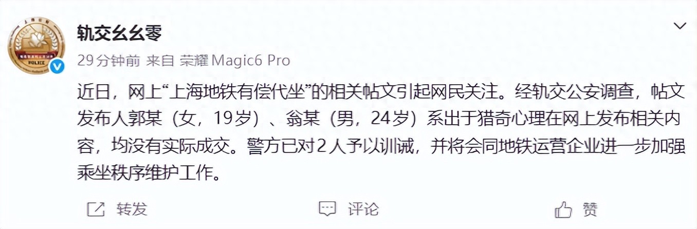 近日,网上“上海地铁有偿代坐”的相关帖文引起网民关注。经轨交公安调查,帖文发布人郭某(女,19岁)、翁某(男,24岁)系出于猎奇心理在网上发布相关内容,均没有实际成交。警方已对2人予以训诫,并将会同地铁运营企业进一步加强乘坐秩序维护工作。来源:@轨交幺幺零